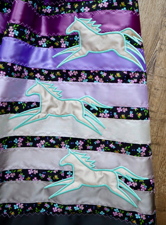 Couture Embroidered Pony Ribbon Skirt Pockets Womens Black Floral Premium Cotton Silver Plum Tones OOAK Indigenous HandMade *up to 50 inches* (enter desired sizes waist size “inches” or Dress/Pants size in order notes)