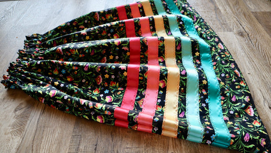 Handmade Ceremony, Casual Ribbon Skirt: Fire Water Tones, Black Indigenous Floral Print, Custom Waist *up to 50 inches* (enter desired sizes waist size “inches” or Dress/Pants size in order notes)