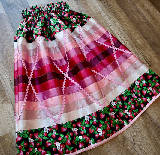Couture Stacked Ribbon Pocket Womens RicRac Black Strawberry Floral Print Premium Cotton Cream Ombre OOAK Indigenous HandMade CustomWaist *up to 50 inches* (enter desired sizes waist size “inches” or Dress/Pants size in order notes)