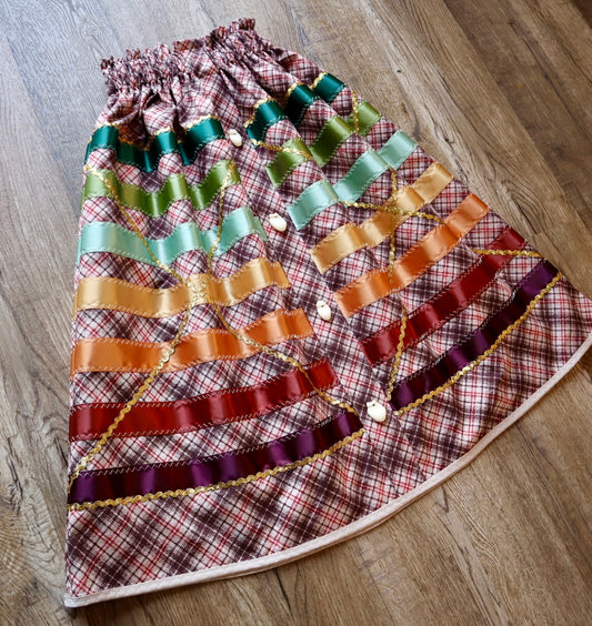 Couture Ribbon Skirt: Brown and Red Plaid Cotton with Faux Elk Teeth “Buttons”*up to 50 inches* (enter desired waist size “inches” or Dress/Pants size in order notes)