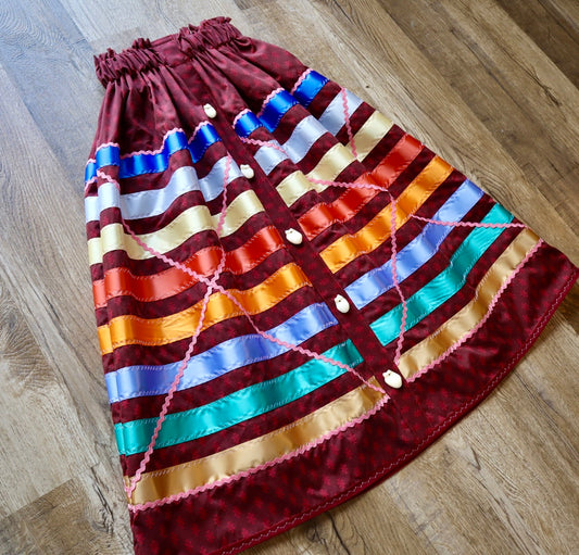 Couture Ribbon Skirt Button Down Pocket Womens Peach RicRac Maroon Geometric Print Cotton Faux Elk Teeth Miscellaneous OOAK Indigenous *up to 50 inches* (enter desired waist size “inches” or Dress/Pants size in order notes)