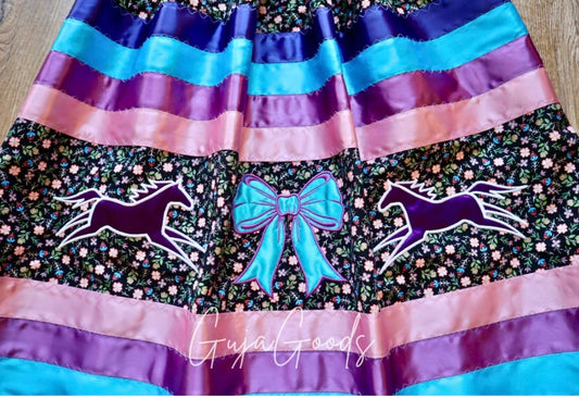 Couture Embroidered Applique Ribbon Skirt Pockets Womens Ivory Floral Premium Cotton Ponies and Bows OOAK Indigenous CustomWaist *up to 50 inches* (enter desired sizes waist size “inches” or Dress/Pants size in order notes)