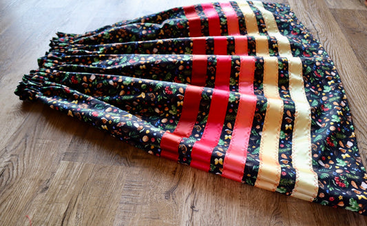 Handmade Ceremony, Casual Ribbon Skirt: Fire Tones, Black Woods Floral Print, Custom Waist *up to 50 inches* (enter desired sizes waist size “inches” or Dress/Pants size in order notes)