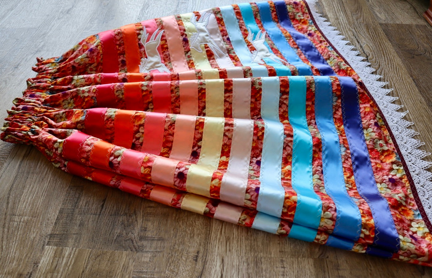 Couture Embroidered Pony Ribbon Skirt Pockets Womens Orange Floral Premium Cotton Fire Water Colours OOAK Indigenous HandMade *up to 50 inches* (enter desired sizes waist size “inches” or Dress/Pants size in order notes)