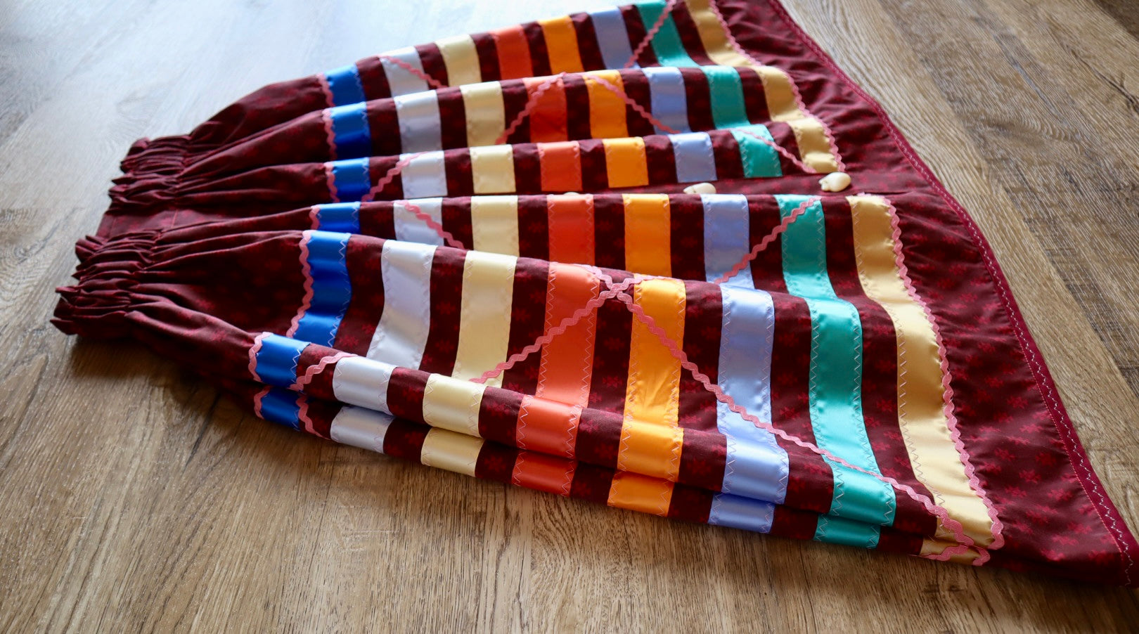 This unique Couture Button Down Ribbon Skirt features 2 XL concealed pockets, Peach Zig Zag Ric Rac, faux Elk Teeth “Buttons” and is made from 100% premium Maroon Geometric Print cotton for maximum comfort. Length is 31 inches. Buyer decides the custom waist up to 50 inches for a perfect fit. Includes 8 Miscellaneous coloured Satin ribbons, thread which is carefully color-matched, while professional seams ensure durability. With a delicate bias hem and paper-bag waist and 1.5 inch non-roll elastic, this OOAK Indigenous handmade skirt supports women-owned small businesses.