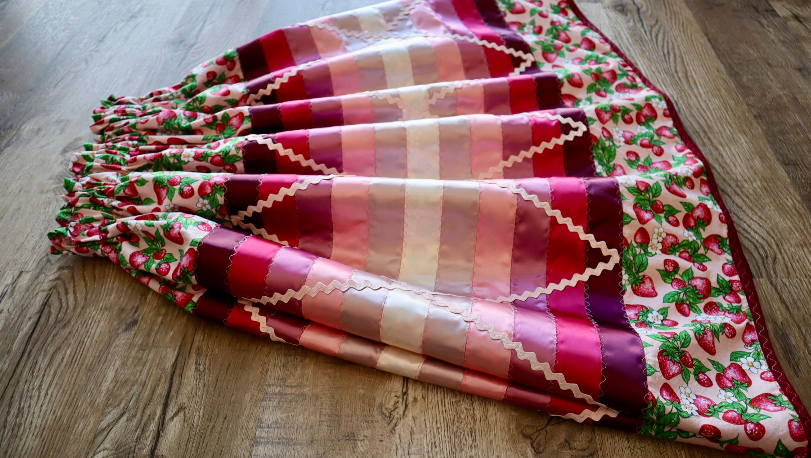 This unique Couture Stacked Ribbon Skirt features 2 XL concealed pockets, Cream Zig Zag Ric Rac, and is made from 100% premium Pink Strawberry Floral Print cotton for maximum comfort. Length is 30 inches. Buyer decides the custom waist up to 50 inches for a perfect fit. Includes 11 Maroon Ombre ribbons, thread which is carefully color-matched, while professional seams ensure durability. With a delicate bias hem and paper-bag waist and 1.5 inch non-roll elastic, this Beautiful Indigenous handmade skirt supports women-owned small businesses.