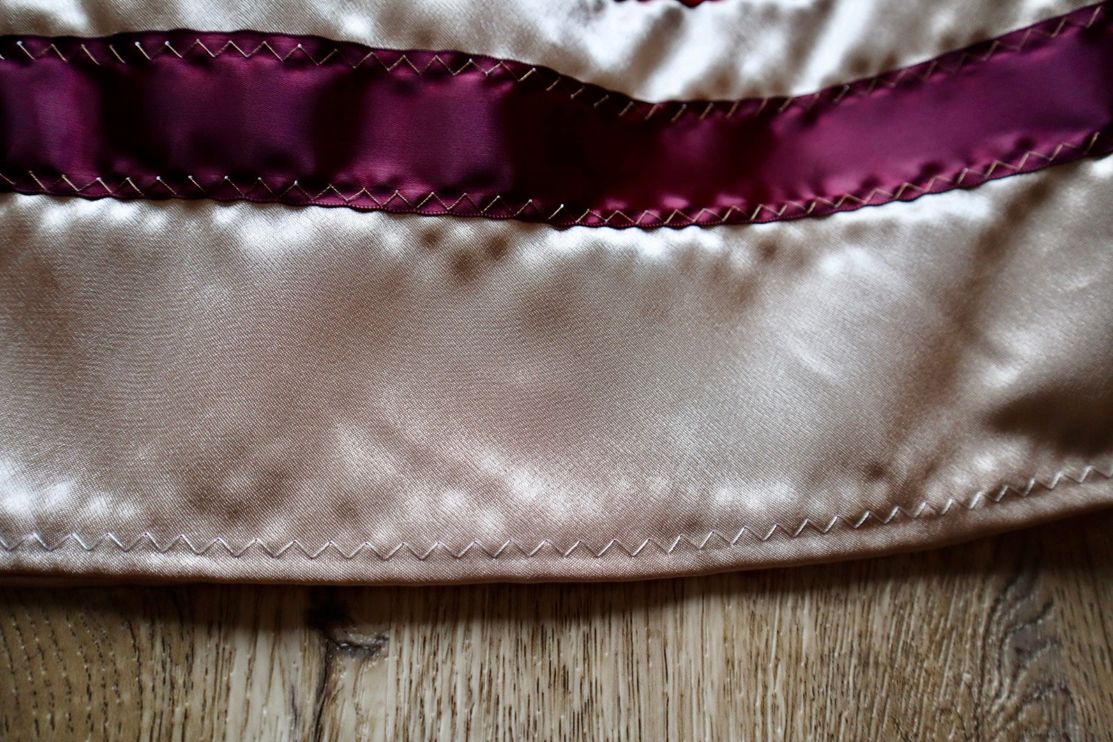 Introducing the Handmade Child Size Ribbon Skirt, made with Champagne Nude Satin and lined with 100% cotton for maximum comfort. This *One-of-a-Kind* skirt features a paper-bag waist with non-roll elastic, ensuring the perfect fit for waist sizes 20-25 inches and a length of 22 inches. The durable, serged seams and color-matched ribbons and thread make this skirt a unique and practical addition to your child's wardrobe.